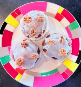 ラムレーズンとココア入りのパン生地を焼いて、ジンジャーパウダーを混ぜたアイシングシュガーをかけて、胡桃をトッピングしました。🫚🍫🍇🍾🍞🍯🧈