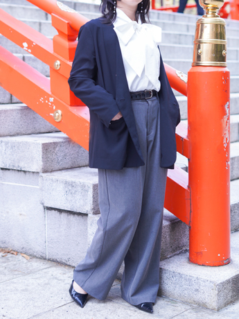 かちっとしたアウターとボトムスに、リボンタイのトップスがガーリーさをプラスしていてとってもおしゃれなまこさんの魅力が溢れております✨
