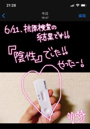 6/11、抗原検査『陰性』2021年6月11日 6/11に行なった抗原検査の結果は『陰性』でした!今後も衛生面や健康面に最大限気を付けて生活をしていきますので、どうぞよろしくお願いいたします。 リサ PCR検査・抗原検査結果,日常Posted by リサ